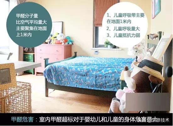 儿童是室内污染,尤其是甲醛超标污染的最大受害者。原因有几点,一是甲醛的分子量比空气平均量大,因此甲醛主要聚集在地面上1米内的空间范围内,而这正好是儿童的主要呼吸带;此外,在安静时,儿童的空气吸入量是成人的两倍,因此儿童对甲醛的吸入比成人多得多;而且,儿童身体功能发展尚未成熟,抵抗力较低,因此最容易成为甲醛的伤害对象。