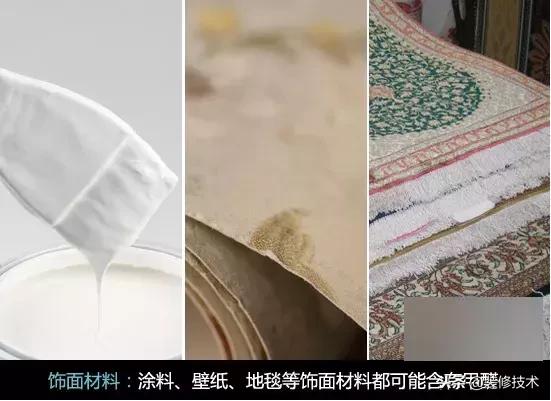 目前广泛使用的乳胶漆中含有防霉防腐剂,因此也含有少量的甲醛。部分类型的壁纸也不同程度地含有甲醛,其粘贴时所用的胶粘剂也会释放出甲醛。此外一些地毯和地毯衬垫生产中都使用了含有甲醛的胶粘剂,也会释放出甲醛。